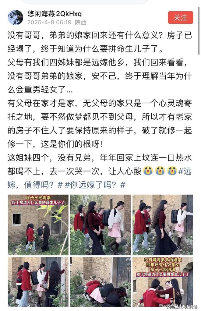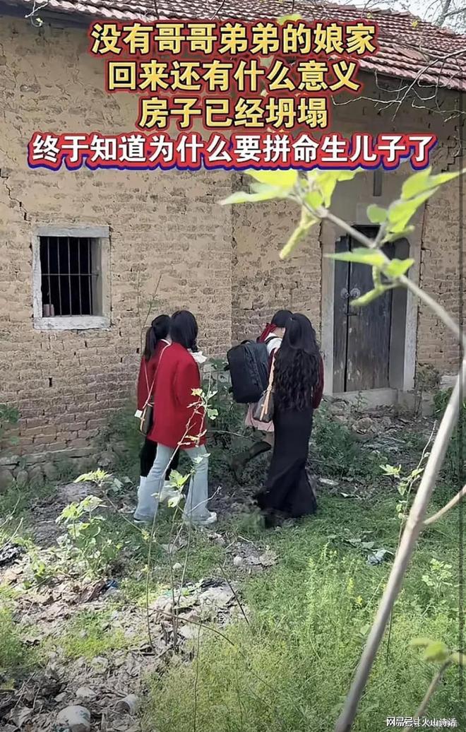 无独有偶,近日有网友发帖,没有哥哥,弟弟的娘家回来还有什么意义?房子已经塌了,终于知道为什么要拼命生儿子了。