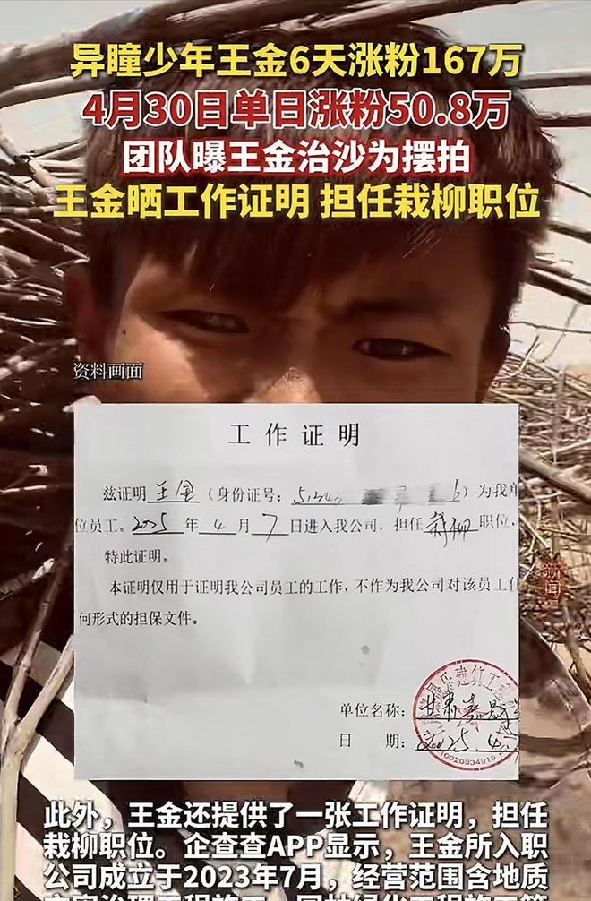 后面,王金也是晒出了自己在这里种植沙柳的务工证明,上面表示,他确实是这里的工人,这点没有假。